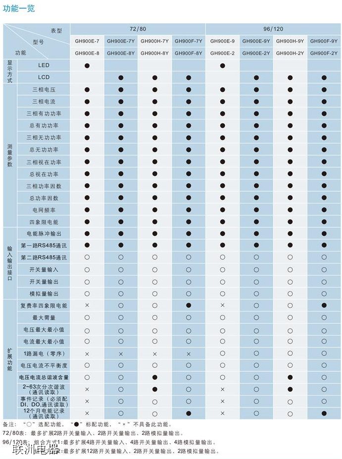 GH900E系列多功能儀表采用現代數字信號處理芯片和高精度的電能計量芯片、能夠精確穩(wěn)定地測量三相電網中的所有常用電力參數:三相電壓、三相電流、有功功率、無功功率、視在功率、電網頻率、功率因數、電能、電壓不平衡度、電流不平衡度、平均電壓、相間電壓夾角、電壓總諧波,電壓2~63次分次諧波,電流總諾波、電流2-63次分次諧波,電壓Z大值Z小值,電流Z大值Z小值,兩個時區(qū)4種費率8個時段。有功無功Z大需量,通過外部漏電(或零序電流互感器實現漏電(或零序)電流的測量、Z多32條開關變位SOE事件記,輸入輸出接口Z多可配備:兩路電能膚沖輸出、兩路數字通迅接口、四路開關量輸入。四路開關量輸出、四路模擬量輸出。