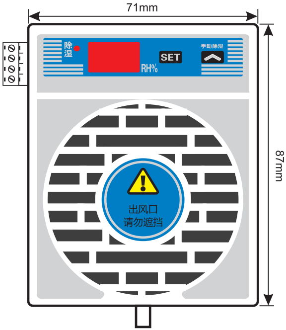 產(chǎn)品簡介 | Description CS820智能型除濕裝置是采用半導(dǎo)體制冷除濕方式,主動(dòng)將密閉空間的潮濕空氣在風(fēng)扇的作用下吸入除濕風(fēng)道,空氣中的水汽經(jīng)過半導(dǎo)體制冷機(jī)構(gòu)后冷凝成水,再通過導(dǎo)水管排出柜體,可以達(dá)到很好的除濕效果。技術(shù)指標(biāo) | Technical indicators 1.輸入規(guī)格: 1路溫濕度輸入模塊 安裝尺寸 | Installation dimensions