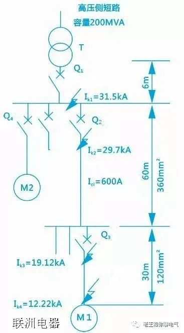 但由于它的延時(shí)通斷能力為30KA,不能滿足Ik1=31.5kA的要求,需跨級(jí)選用DW15-2500斷路器,其延時(shí)通斷能力為40kA,將其瞬時(shí)整定電流整定在1.1×29.7=32.67kA,由于該值小于DW15-2500斷路器延時(shí)短路通斷能力,所以不要瞬時(shí)脫扣器也可正常工作。