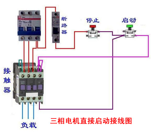在一般情況下,由公用變壓器供電的三相電機(jī),當(dāng)單機(jī)容量小于14千瓦時(shí),允許直接起動(dòng)。用斷路器、啟動(dòng)停止按鈕和交流接觸器組合在一起便組成一個(gè)Z簡(jiǎn)單的直接起動(dòng)控制線路。例如以下這個(gè)三相電機(jī)直接啟動(dòng)接線圖就比較簡(jiǎn)單,只要合上開關(guān)接通電源后,按下啟動(dòng)按鈕,電機(jī)就能直接起動(dòng)、運(yùn)轉(zhuǎn),按下停止按鈕電機(jī)便停止。