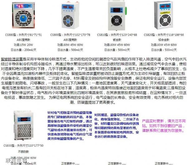 CS800、CS810、CS820、CS880配電柜除濕器 CS800、CS810、CS820、CS880系列的除濕器用于開關柜、配電柜、控制柜的除濕之用。這是一種排水弄除濕器,功率有大有小和相應的排水量。具體參數如下:看看視頻: Home > 配電柜 > 日期:2023-9-22 來源:www.daishuyu.com 發布:前前 閱讀: 上一篇:配電箱字母含義 圖紙中常見配電箱字母表示意思 下一篇:MTS-8030GY-32L、MTS-8060GY-32L電柜除濕器 配電箱安裝屬于什么工程 配電系統接地的設置 配電箱配置電器簡要說明 BCT系列電力配電用互感器 BCT系列電力配電用互感器 HBB-CS800電箱除濕器使用說明書.pdf 推薦 多功能電力儀表CPK-D3B的說明書HDZJ-130X 井蓋防盜系統行業國際形勢初學電工怎樣看懂電路圖 ZWN-G1(TH)智能溫度濕度控制器的產品概述接地電阻不準確的處理辦法和預防措施DH20G-100A電機保護器技術參數與使用S811R24N3S、S811R30N3S報價EVERQ6-320-6、QR75A1-I礦井風機起動裝置MZY1-5030、JJR2-200電動機晶閘管軟起R22空調內有空氣對空調有影響嗎 建議關注 消防泵啟動器MSKRQ1-S-7.5KP雙電源切換開關TLQ3-40排污泵啟動器JJ1-40KWATS雙電源開關BQ3-50A/4P智能雙電源自動轉換開關BJMQ8G-320/4PCB級雙電源轉換開關GFATS1-125/3PCBEPM-07電力網絡分析儀表雙電源切換開關W-N2/100A/4P(LCD)PZ211-1U1X1 數顯電壓表TH300VA-44離心風機軟啟動ADR5-45KW交直流電測儀表RC-EMP194Z-9HY水泵軟起動SNR5-400電力電容制造BSMJ0.42-20-1雙電源和雙回路切換裝置TKQG-800