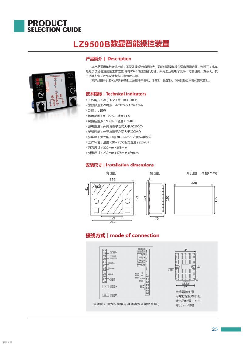 開(kāi)關(guān)柜智能操控裝置是根據(jù)當(dāng)前中壓系統(tǒng)開(kāi)關(guān)柜技術(shù)發(fā)展而設(shè)計(jì)開(kāi)發(fā)的一種新型的模塊化、智能型的操作測(cè)量顯示裝置。產(chǎn)品集主回路模擬指示、帶電指示及閉鎖、驗(yàn)電功能、溫濕度數(shù)字實(shí)時(shí)顯示、自動(dòng)加熱除濕控制、自動(dòng)排風(fēng)降溫控制、斷路器分合閘狀態(tài)指示、儲(chǔ)能、接地開(kāi)關(guān)指示、手車(chē)位置指示、智能防誤語(yǔ)音提示、人體感應(yīng)報(bào)警語(yǔ)音警示、回路電流、電壓、頻率、功率、電能、斷路器進(jìn)線出線母排溫度測(cè)量顯示、故障記錄查詢、時(shí)鐘指示、手動(dòng)自動(dòng)儲(chǔ)能選擇、遠(yuǎn)程就地切換、分閘合閘操作以及RS-485通訊接口等功能于一體。產(chǎn)品以一體化布局配套裝備于開(kāi)關(guān)柜,將簡(jiǎn)化開(kāi)關(guān)柜的面板結(jié)構(gòu)設(shè)計(jì),美化開(kāi)關(guān)柜的面板布局,完善開(kāi)關(guān)狀態(tài)的指示功能和安全性能。產(chǎn)品可用于3~40kV戶內(nèi)的開(kāi)關(guān)柜,適用于中置柜、手車(chē)柜、固定柜、環(huán)網(wǎng)柜等多種開(kāi)關(guān)柜。產(chǎn)品符合IEC255-22要求。DG-A01開(kāi)關(guān)柜智能操控裝置的生產(chǎn)廠家是湖南聯(lián)洲電器
