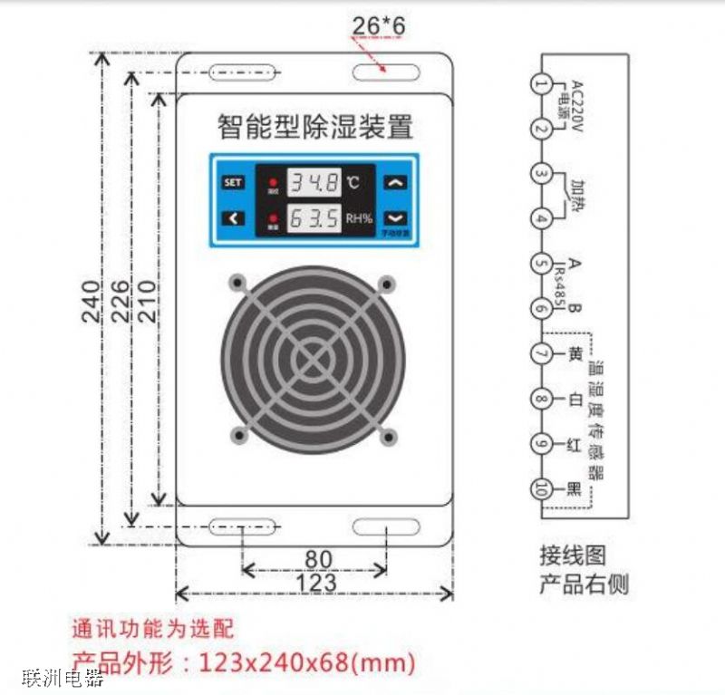 1、體積小、重量輕、安裝方便快捷,專為電力行業設計自動運行與手動除濕功能切換、溫度啟動值、除濕啟動值和濕度斷開值可調