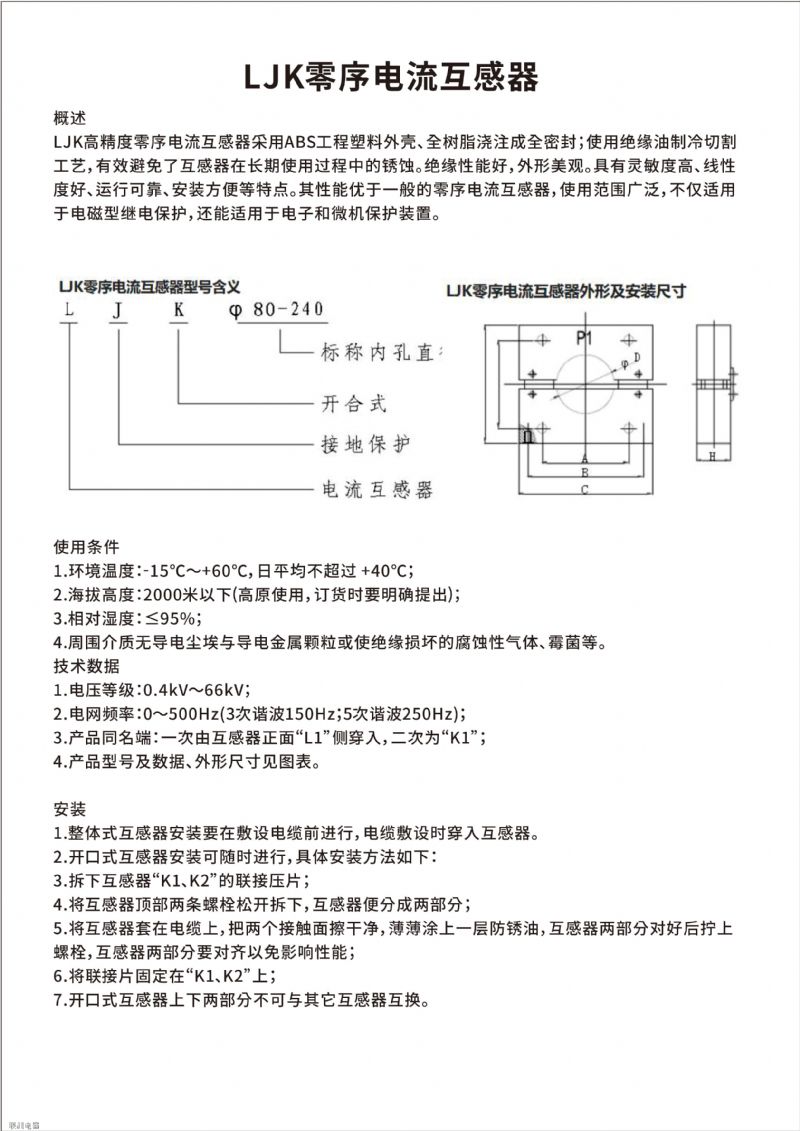LJK高精度零序電流互感器采用ABS工程塑料外殼、全樹脂澆注成全密封;使用絕緣油制冷切割工藝,有效避免了互感器在長期使用過程中的銹蝕。絕緣性能好,外形美觀。其性能優于一般的零序電流互感器,使用范圍廣泛,不僅適用于電磁型繼電保護,還能適用于電子和微機保護裝置。