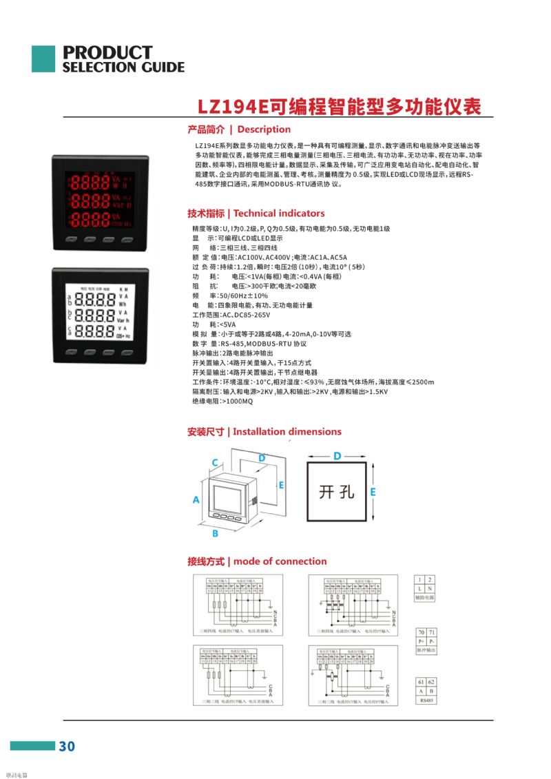 多功能電力儀表能夠高精度測量三相電網(wǎng)系中所有電參數(shù):三相電流,電壓,有功功率。無功功率,功率因數(shù),電網(wǎng)頻率,有功電能,無功電能,并帶有通訊接口和電能脈沖輸出功能,采用MODBUS-RTU通訊協(xié)議,實現(xiàn)LED現(xiàn)場顯示和遠(yuǎn)程RS485數(shù)字通訊.