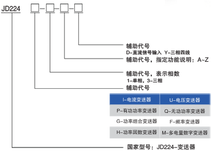 JD224系列變送器用于電力參數的信號轉換之用,將電流、電壓、功率、頻率等電參數轉換成標準的4*20MA或0-20MA信號。此系列變送器分為單相變送器和三相變送器,具體型號功能請細看以下型號定義。